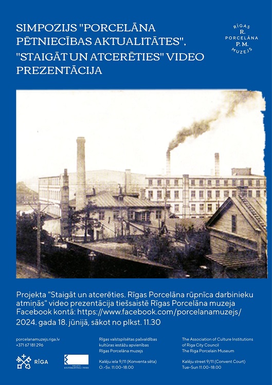 Rīgas Porcelāna muzejs 18. jūnijā prezentēs dokumentālo video «Staigāt un atcerēties. Rīgas Porcelāna rūpnīca bijušo darbinieku atmiņās», programmu papildinās simpozijs, veltīts porcelāna pētniecības aktualitātēm. Pasākums tiks straumēts tiešsaistē, muzeja sociālā portāla Facebook kontā.